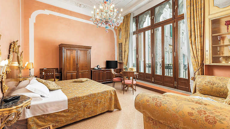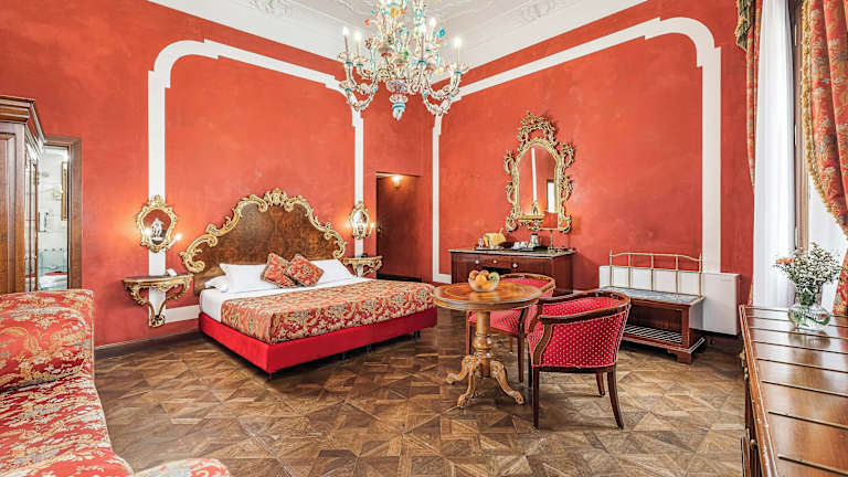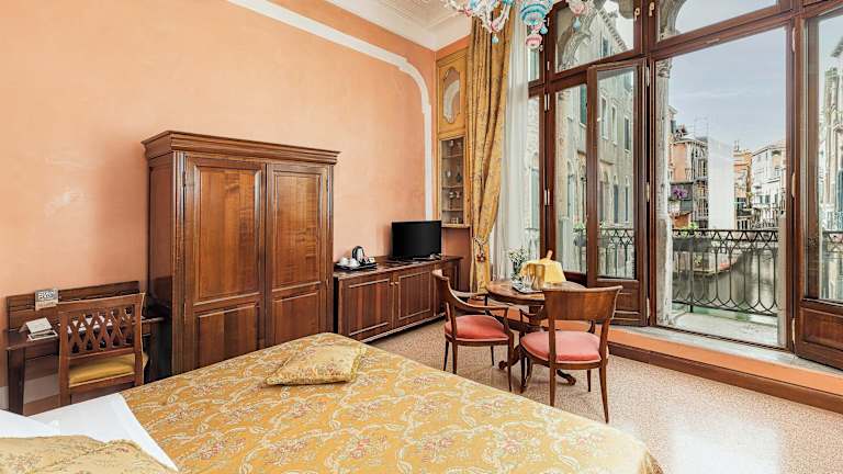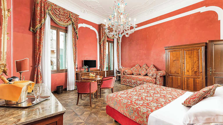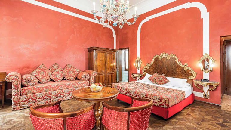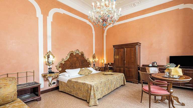 Die 22 Zimmer des Hotels erstrecken sich über 3 Etagen und sind mit einem Aufzug erreichbar. Jedes Zimmer ist individuell eingerichtet und im klassisch-venezianischen Stil gehalten. Zur Ausstattung gehören eine Klimaanlage, eine individuell steuerbare Heizung, ein Safe, eine Minibar und ein Schreibtisch. Tee- und Kaffeezubehör steht ebenfalls zur Verfügung. Die Badezimmer verfügen entweder über eine Dusche oder eine Badewanne sowie einen Haartrockner.