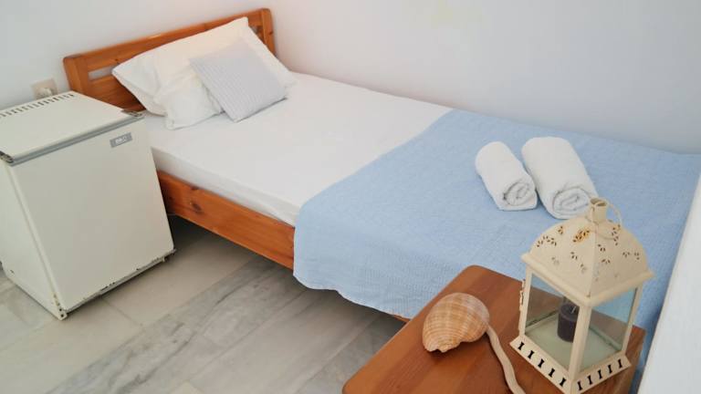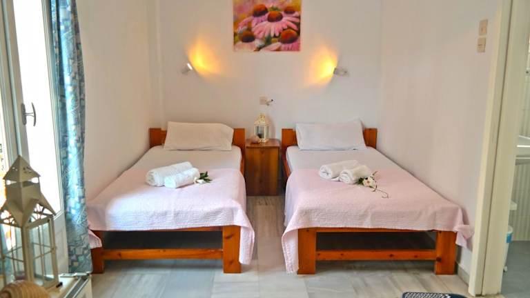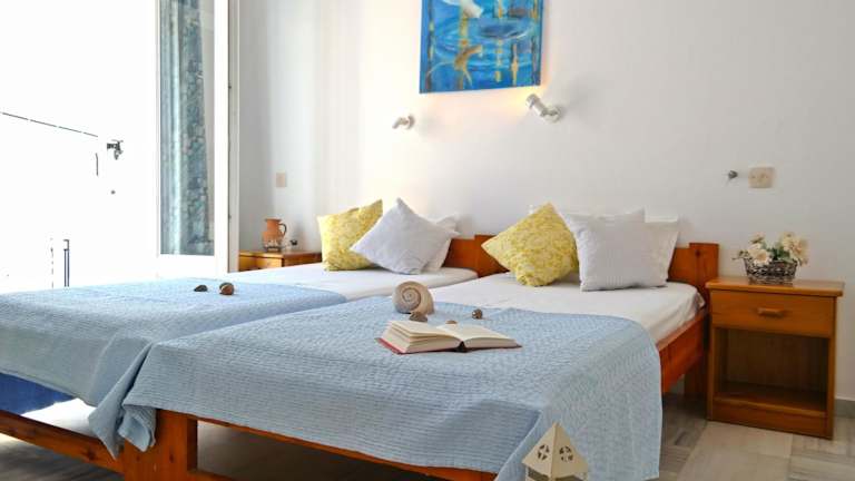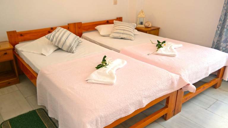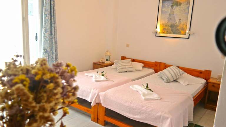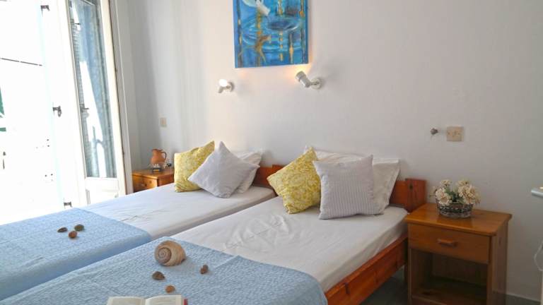 Die Zimmer im Hotel Sanoudos sind komfortabel und klimatisiert. Jedes Zimmer verfügt über einen Balkon mit einem Holztisch und Liegestühlen, auf dem Sie die Sonne und die frische Luft genießen können. Zur Ausstattung gehören auch ein TV, ein Mini-Kühlschrank und ein eigenes Bad mit einer Dusche.
