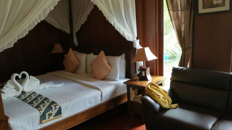 Die Unterkünfte im Sayang Beach Resort sind klimatisiert und verfügen über traditionelles Holzdekor. Jedes Zimmer bietet ein eigenes Badezimmer, einen eigenen Balkon, eine Minibar, Kabel-TV, Tee- und Kaffeezubereitungsmöglichkeiten sowie einen Kühlschrank. Genießen Sie den Komfort und die Gemütlichkeit dieser traditionellen Unterkünfte.