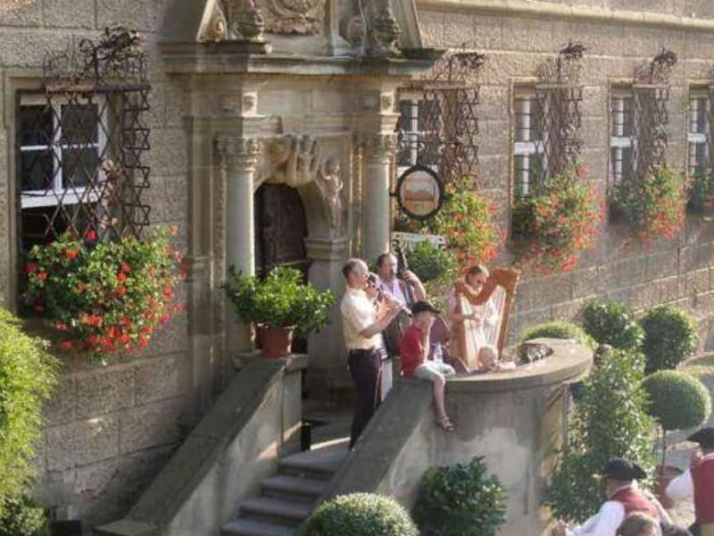 Das Frühstück ist im Zimmerpreis inklusive. Es gibt jedoch kein Tagesrestaurant im Schloss. Auf Vorbestellung können wir jedoch eine fränkische Brotzeit für Hotelgäste richten. Gasthäuser gibt es in den umliegenden Orten. Manchen kulturellen Veranstaltungen folgt ein optionales Abendessen im Schloss. Getränke stehen in einem Kühlschrank im Kaminzimmer zur Selbstbedienung bereit. Das schlosseigene Weingut Wein von 3 bietet Weine, die wir auf ca. 2 ha Rebfläche in der Gemeinde ausbauen.