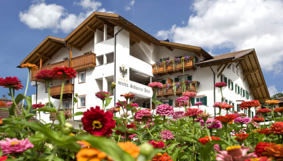 Das 4-Sterne Hotel Schwarzer Adler, dessen Ursprünge auf das 14 Jhd. zurückgehen, zählt zu den ältesten Gasthäusern Tirols. Es liegt im Zentrum von Seis, nur 1 km von der Panoramabahn zur Seiser Alm, der größten Hochalm Europas, entfernt. Dieses Hotel gehört zu den mit „sehr gut“ bewerteten Häusern in Italien. Es hat das Qualitätssiegel HolidayCheck Quality Selection im Jahr 2014 verliehen bekommen. Seis liegt auf 1000 m ü.d.M. in einer sonnigen Höhenmulde zu Füßen des Schlerns und seiner imposanten Santnerspitze, umgeben von saftigen Wiesen, mächtigen Wäldern, kühnen Bergspitzen, geheimnisvollen Ruinen und malerischen Kirchlein. Den Golfplatz St. Vigil Seis erreichen Sie einfach und bequem in 5 Minuten. Nach mehrmaligem Wechsel ging das Hotel 1986 in den Besitz unserer Familie über, und mit dem Umbau 1996 ist moderner Komfort in die alten Gemäuer eingezogen. Dennoch ist es uns gelungen, die ursprüngliche Harmonie von Mauern und Gewölben und die Wärme und Behaglichkeit der alten Stuben zu erhalten. Der erhalten gebliebene zweigeschossige Keller mit gestampftem Erdboden birgt edle Weine und Schnäpse, sowie Eingelegtes zur Weiterverarbeitung in erlesene Speisen und Spezialitäten der Südtiroler und italienischen Küche. Das zuletzt 2020 renovierte Hotel verfügt über komfortabel eingerichtete Zimmer und Suiten sowie zwei Apartments, einen Wintergarten mit herrlichem Blick auf den Schlern und die Santnerspitze zum Loungen und Relaxen, eine Panorama-Dachterrasse mit fantastischem Rundumblick zum Sonnen und Genießen, ein neues Hallenschwimmbad mit Liegewiese sowie einen eigenen Wellnessbereich mit Sauna, Dampfbad, Infrarot-Kabine und schönem Ruheraum. Massagen und Schönheitspflege werden ebenfalls angeboten.