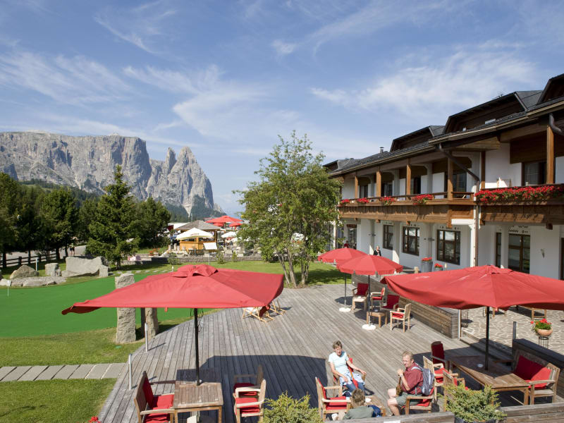 Das Hotel befindet sich auf 1850 Meter Höhe auf der größten Hochalm Europas, in unmittelbarer Nähe zu Seilbahnen und Bushaltestelle. Das kleine Zentrum der Seiser Alm ist der perfekte Ausgangspunkt für Wanderungen, Radtouren und Kutschenfahrten auf dem Hochplateau. Nach Seis und Kastelruth sind es jeweils ca. 10 km, zum Bahnhof Bozen ca. 35 km und zum Flughafen Innsbruck ca. 115 km.