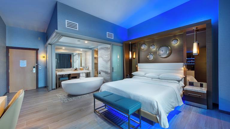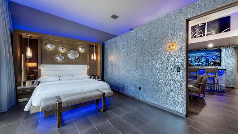 Die Zimmer sind modern und verfügen über einen Whirlpool für zwei Personen, eine Espressomaschine sowie einen möblierten Balkon.