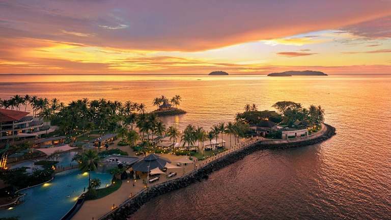 Das Shangri-La's Tanjung Aru Resort & Spa liegt auf einer Halbinsel, umgeben vom Südchinesischen Meer. Die ruhige Lage ermöglicht eine entspannte Atmosphäre, während lokale Sehenswürdigkeiten, das Stadtzentrum und der internationale Flughafen Kinabalu nur etwa 10 Minuten entfernt sind. Der Strand ist sandig und lädt zum Entspannen ein.