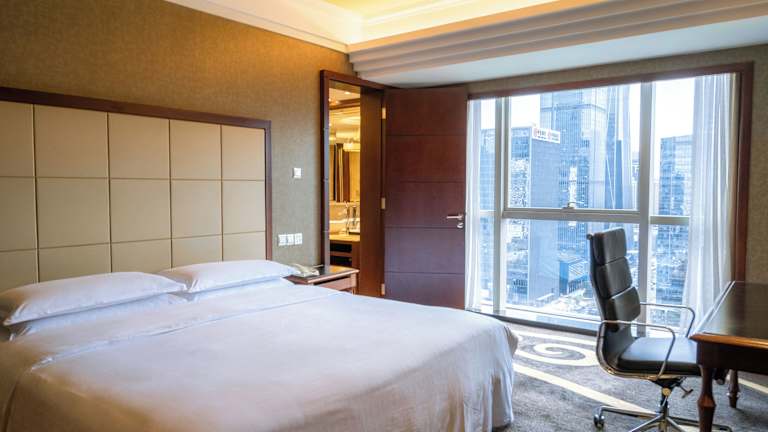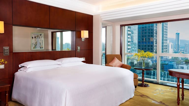 Das Sheraton Shenzhen Futian Hotel bietet stilvoll und modern eingerichtete Zimmer mit dunklen Holzmöbeln. Jedes Zimmer verfügt über einen Flachbild-TV, einen Sitzbereich mit einem Sofa und ein eigenes Bad mit einer Badewanne.