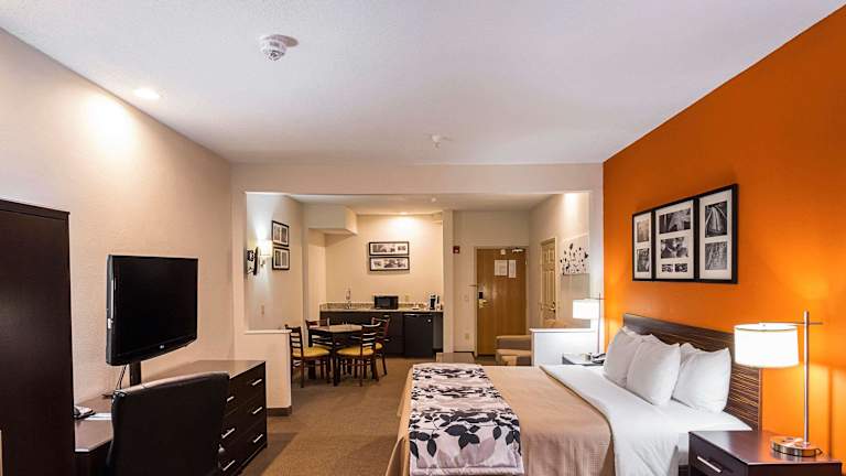 Die Zimmer im Sleep Inn & Suites Hotel sind gut ausgestattet und bieten alles, was Sie für einen angenehmen Aufenthalt benötigen. Jedes Zimmer verfügt über einen 32-Zoll-Flachbild-TV, eine Kaffeemaschine, ein Bügeleisen, ein Bügelbrett, eine Mikrowelle und einen Kühlschrank. Die Suiten bieten zusätzlich ein Schlafsofa, einen Tisch und Stühle. Für Entspannung und Luxus können Sie eine der Whirlpool-Suiten für 2 Personen wählen.
