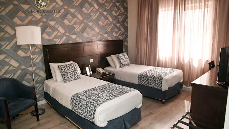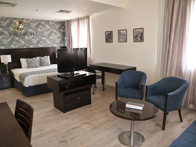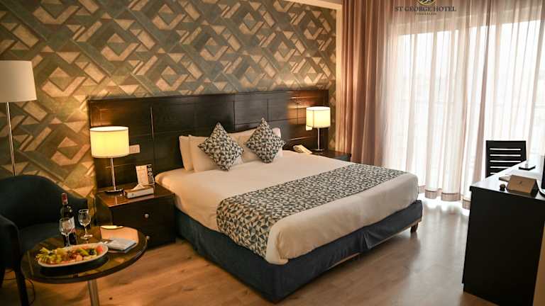 Das St. George Hotel verfügt über 129 Nichtraucherzimmer, die sich über 5 Etagen erstrecken. Die Zimmer sind modern eingerichtet und bieten Annehmlichkeiten wie Klimaanlage, Heizung, Safe, Minibar, Tee- und Kaffeezubereitungsmöglichkeiten sowie kostenfreies WLAN. Einige Zimmer verfügen über einen Balkon.