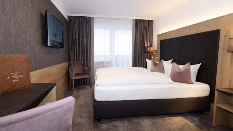 Die Zimmer im Hotel St. Nikolaus sind traditionell eingerichtet und bieten Ihnen einen gemütlichen Rückzugsort nach einem Tag voller Abenteuer. Jedes Zimmer verfügt über einen eigenen Balkon, auf dem Sie den Blick auf die umliegende Landschaft genießen können. Zur Ausstattung gehören auch Kabel-TV und ein eigenes Badezimmer. Darüber hinaus steht Ihnen ein gemeinsamer Skiraum mit einem Skischuhtrockner zur Verfügung, um Ihre Ausrüstung trocken und sicher aufzubewahren.