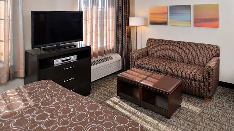 Die 90 Zimmer des Hotels sind komfortabel eingerichtet und verfügen über eine Küchenzeile mit Kühlschrank, Geschirrspüler und Mikrowelle. Zur Ausstattung gehören auch ein Schreibtisch, ein TV-Gerät mit Satellitenempfang und Pay-per-View-Optionen sowie kostenfreies WLAN.