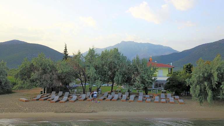 Das Hotel Stella in Skala Rachoniou auf Thassos bietet eine ideale Lage direkt am Sandstrand und umgeben von blühenden Gärten. Die Zimmer sind einfach, aber gemütlich eingerichtet und verfügen über einen Balkon mit Blick auf den Garten. Das hoteleigene Restaurant mit Strandbar serviert griechische Gerichte und erfrischende Getränke. Die Stadt Limenas und der Hafen sind bequem mit dem Auto erreichbar und es gibt kostenlose Parkplätze am Hotel.