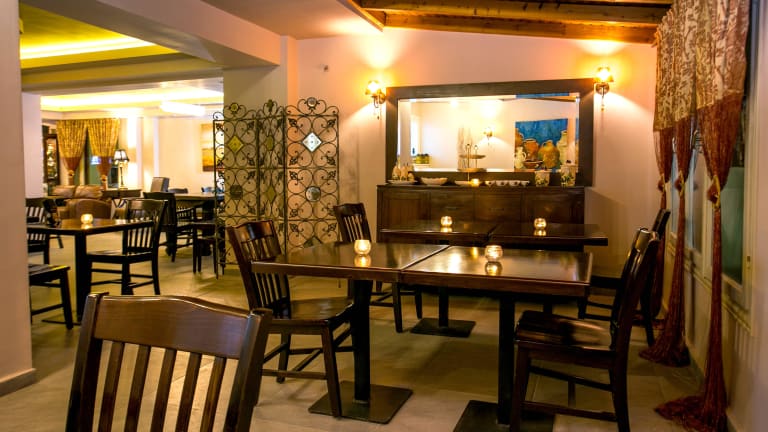Das Hotel bietet eine Verpflegung in Form von Frühstück und Halbpension an. Frühstück wird als Buffet serviert, während das Abendessen im Restaurant auf griechische, mediterrane und regionale Küche spezialisiert ist. Hier stehen auch speziele Gerichte für Allergiker (glutenfrei, lactosefrei) sowie vegetarische Optionen zur Verfügung. Zusätzlich gibt es verschiedene Bars, darunter eine Cocktailbar und eine Lobbybar, die jeweils gegen Gebühr Getränke anbieten.