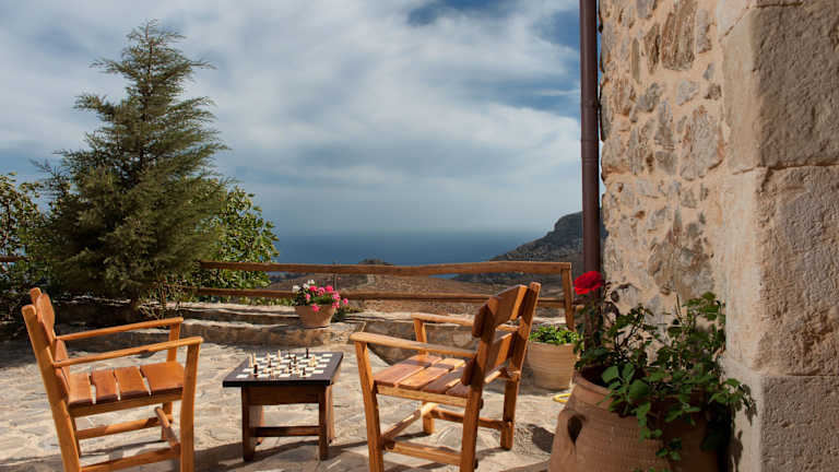 Das Restaurant im Zentrum des Komplexes bietet einen herrlichen Meerblick und serviert ein köstliches Frühstück mit regionalen Spezialitäten wie Pfannkuchen, Eiern, Honig und Joghurt. Zum Mittag- und Abendessen können Sie traditionelle Gerichte aus regionalen Zutaten genießen.