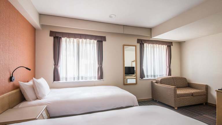 Das b suidobashi Hotel verfügt über 99 Zimmer, die sich über 8 Etagen erstrecken. Die Zimmer sind über einen Aufzug erreichbar und bieten eine komfortable und moderne Ausstattung. Zur Ausstattung gehören eine Klimaanlage, ein Doppelbett, ein Kühlschrank, ein Telefon und kostenfreies WLAN. Hausschuhe und ein Haartrockner sind ebenfalls vorhanden.