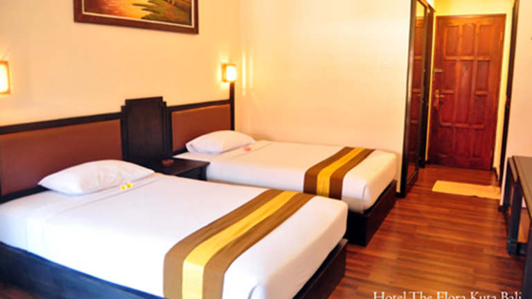 Das Flora Kuta Bali Hotel bietet 10 geschmackvoll eingerichtete Zimmer, die alle über einen eigenen Balkon verfügen. Die Zimmer sind mit Fliesenboden und hellen Holzmöbeln ausgestattet und bieten Annehmlichkeiten wie einen Sat-TV, einen Schreibtisch, einen Wasserkocher und eine Minibar.
