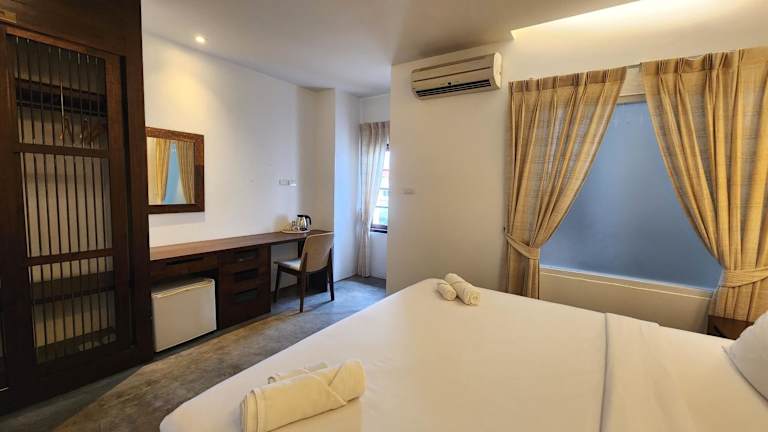 Direkt an einer der Hauptstrassen um die alte Stadt gelegen. Daher 24 Stunden sehr, sehr laut. Ohne Ohrstöpsel kein Schlaf möglich. Nach dem Wunsch das Hotel zu wechseln, wurde 50% der ausstehenden Tage verlangt mit der Begründung, daß man Buchungen abgelehnt hätte. Aus Kostengründen Hotel nicht gewechselt und waren fast immer die einzigen Gäste!!
