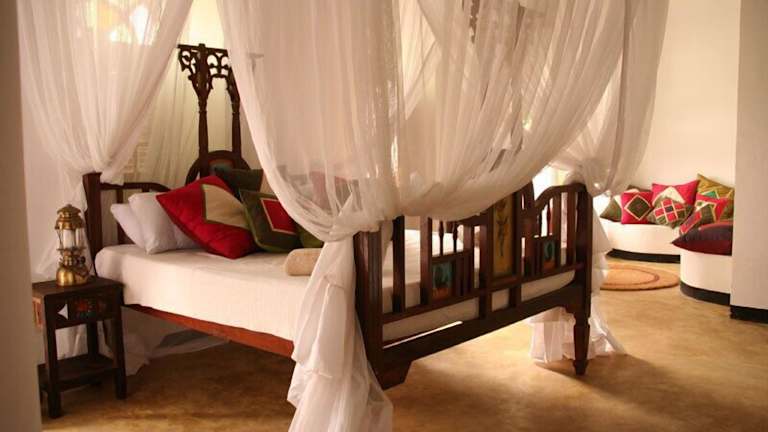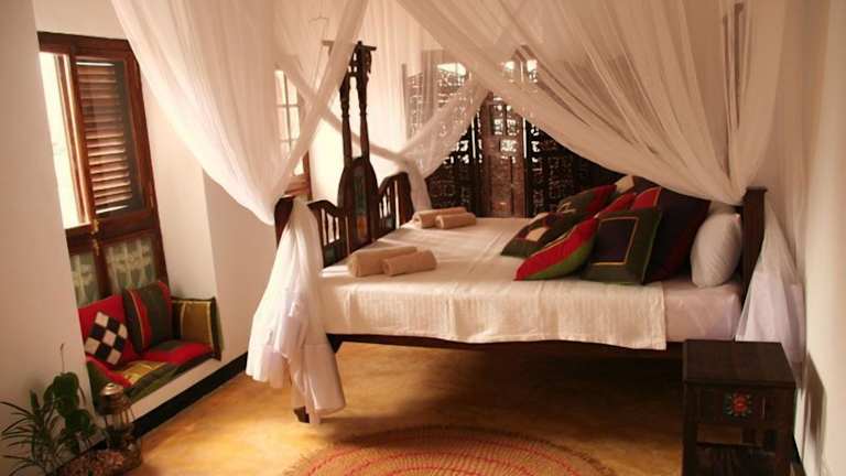 Das Swahili House verfügt über 22 Zimmer, die sich auf 5 Etagen verteilen. Jedes Zimmer ist individuell im traditionellen Swahili-Stil eingerichtet und mit einem Ventilator ausgestattet. Die Betten sind mit Moskitonetzen umgeben. Die Badezimmer verfügen entweder über eine Badewanne oder eine Dusche.