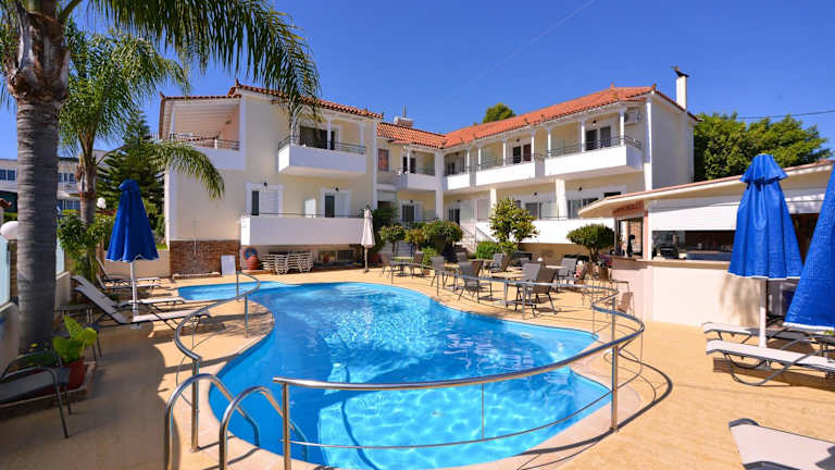 Das Theoxenia Hotel Apartments bietet einen privaten Swimmingpool mit Liegen und Sonnenschirmen, ideal zum Entspannen und Sonnenbaden. Das Hotel organisiert auch verschiedene Unterhaltungsprogramme, darunter griechische Musikabende und Partys am Nachmittag. In der Umgebung finden Sie auch Möglichkeiten zum Einkaufen, Supermärkte, Autovermietungen und öffentliche Verkehrsmittel für weitere Freizeitaktivitäten.