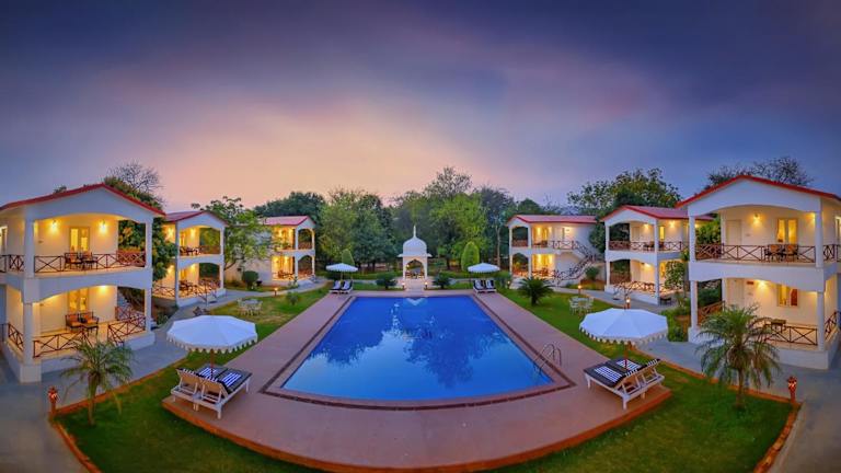Das Tiger Den Resort in Khilchipur bietet eine komfortable Unterkunft mit einem Außenpool, kostenfreien Privatparkplätzen und einem schönen Garten. Das Resort verfügt über ein Restaurant und eine Bar, sowie eine 24-Stunden-Rezeption und kostenfreies WLAN. Die Zimmer sind geräumig und gut ausgestattet, mit eigenem Bad, Flachbild-TV und Klimaanlage. Jeden Morgen wird ein köstliches vegetarisches Frühstück serviert. Das Resort bietet zudem einen Kinderspielplatz und ist ein idealer Ausgangspunkt, um das Nationale Chambal-Heiligtum zu erkunden.