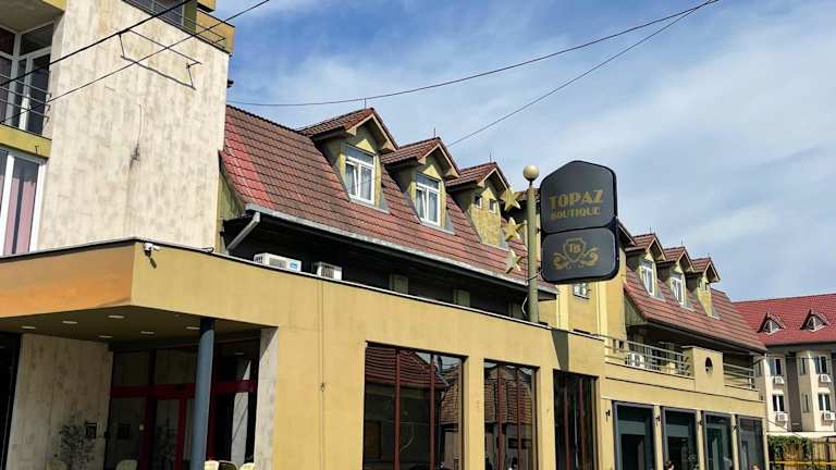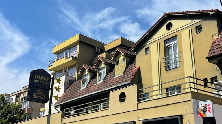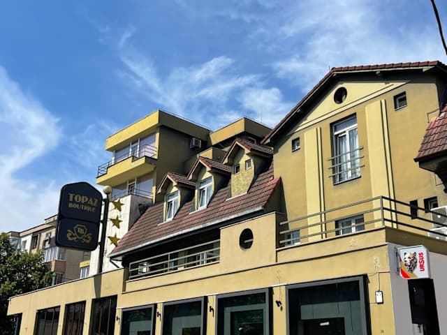 Das Topaz Boutique Hotel liegt in einem Wohngebiet von Cluj-Napoca, nur 5 Fahrminuten vom Stadtzentrum und 10 Fahrminuten vom Flughafen entfernt. Es bietet eine günstige Lage in der Nähe von Geschäfts- und Bankenvierteln sowie Einkaufsmöglichkeiten, Theater und Oper. Sporteinrichtungen, Museen, Universitäten, der Botanische Garten und der Stadtpark sind ebenfalls in nur etwa 10 Minuten erreichbar. Die Anbindung an das öffentliche Verkehrsnetz ist nur ca. 200 m entfernt. Der lokale Bahnhof und der Busterminal sind etwa 4 km entfernt, während der internationale Flughafen Cluj-Napoca etwa 8 km entfernt liegt.