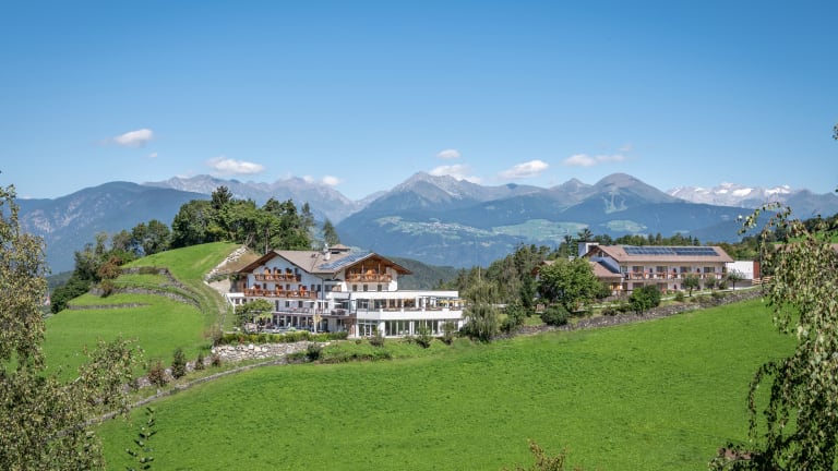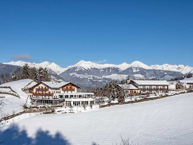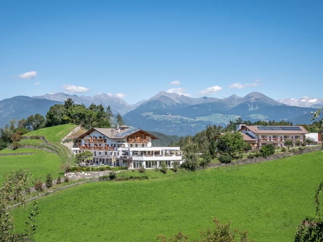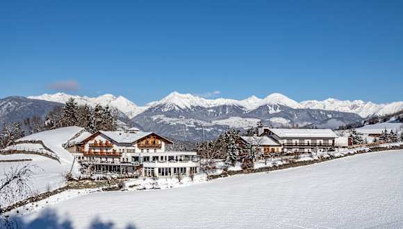 Ruhige Einzel-Panoramalage • Hotel auf 880 m Meereshöhe • Blick ins Eisacktal/Brixen bzw. Zillertaler Alpen • 300 Sonnentage im Jahr • 3 km nach St.Andrä, 4 km zur Kabinenbahn Plose und 7 km nach Brixen • Bushaltestelle „Karnol“ 100m vom Hotel