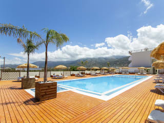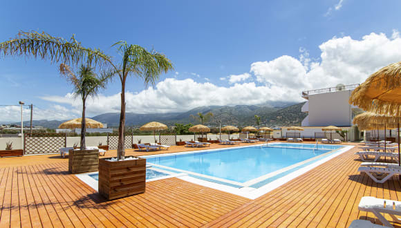 Hotel Triton Hotel lies approx. 300 m from the sandy beach. At the beach are sun loungers and sun umbrellas for a fee available. The city Malia is approx. 500 m away. The nearest shopping facilities are located approx. 300 m from the hotel, a supermarket can be reached after around 50 m. It is only 100 m from the hotel to the nearest bars and restaurants. For evening dancing you will find a nightclub in a distance of approx. 300 m. The following attractions can be reached from the hotel: Malia Palace (approx. 2 km away), Knossos Palace (approx. 38 km away), Lassithi Plateau (approx. 20 km away) and Vai Palm-Forest (approx. 110 km away). For mobility during your holiday, there are a taxi rank (around 100 m away), a bus stop (approx. 500 m away) and a car rental company. For medical treatment in emergencies there is a hospital around 35 km away. The airport (HER) is approx. 30 km away. Another airport (CHQ) is located approx. 180 km away.
