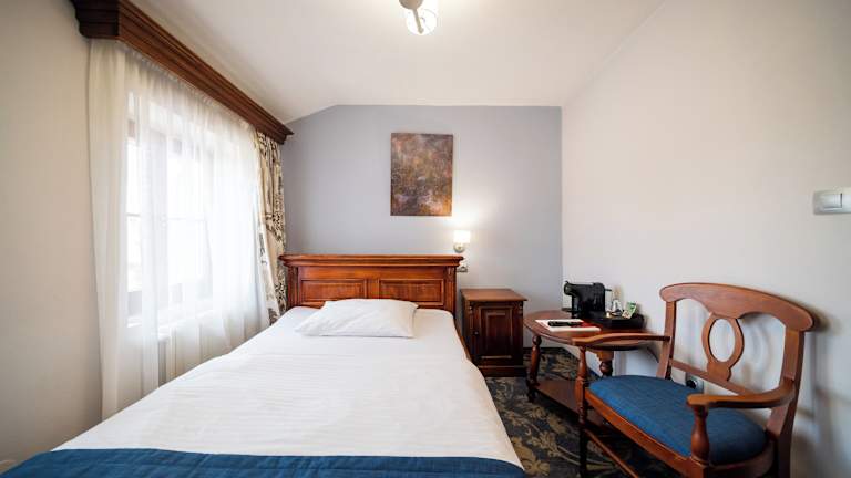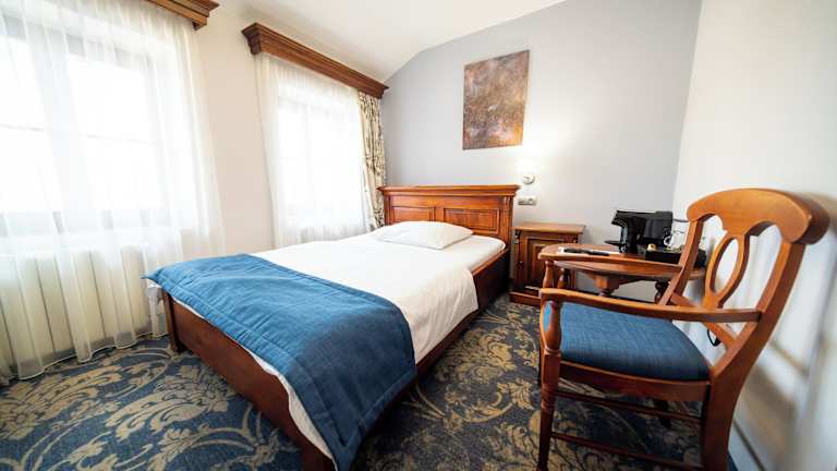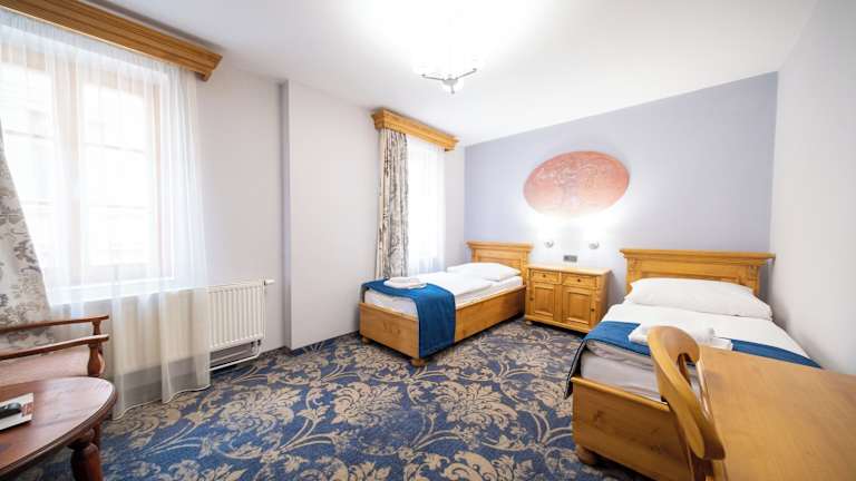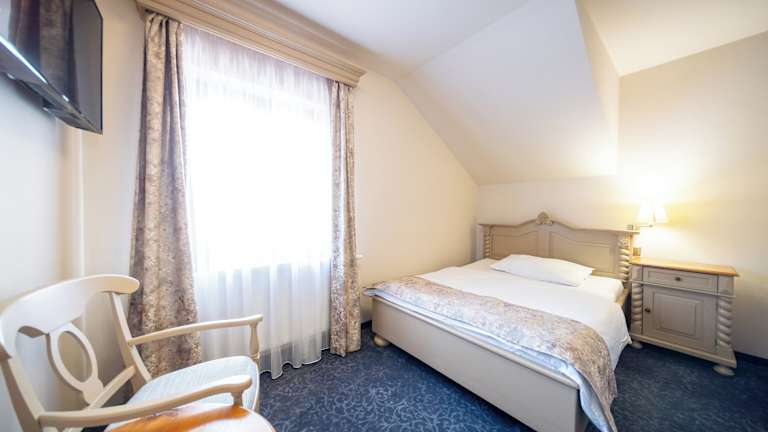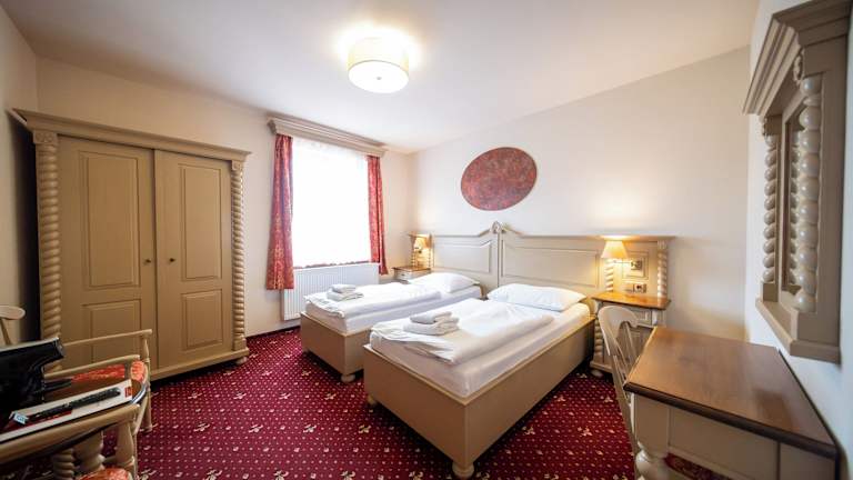 Die Zimmer sind mit einem TV und kostenfreiem WLAN ausgestattet. Des Weiteren verfügen sie über einen Schreibtisch und einen Sitzbereich. Die Einrichtung der Zimmer passt zur mittelalterlichen Atmosphäre der historischen Stadt.