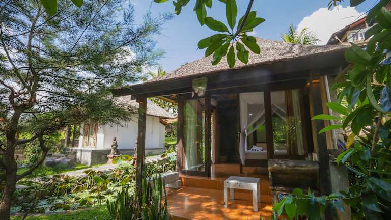 Die Zimmer im Ubud Sari Health Resort sind komfortabel und mit allen Annehmlichkeiten ausgestattet, die Sie für einen angenehmen Aufenthalt benötigen. Jedes Zimmer verfügt über Klimaanlage und Moskitonetze, um Ihnen einen erholsamen Schlaf zu ermöglichen. Einige Zimmer bieten auch eine Terrasse mit Blick auf den Pool, während andere einen Balkon mit Blick auf die grüne Umgebung haben. Jedes Zimmer verfügt über einen gemütlichen Sitzbereich und ein eigenes Bad.