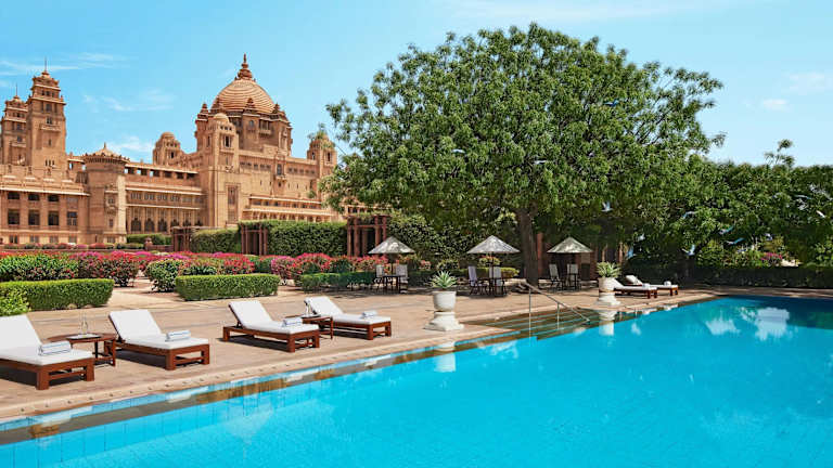Das Umaid Bhawan Palace in Jodhpur ist ein beeindruckender Sandsteinpalast, der zu den größten Privatresidenzen der Welt gehört. Mit seiner Mischung aus Art-Deco- und Renaissancestil, zwei Pools und einem luxuriösen Spa bietet das Hotel eine königliche Atmosphäre und erstklassigen Komfort. Die geräumigen Zimmer sind mit modernen Annehmlichkeiten ausgestattet und bieten einen atemberaubenden Blick auf Jodhpur. In der Nähe finden Sie zahlreiche Sehenswürdigkeiten und das Hotel bietet eine Vielzahl von Freizeitmöglichkeiten, darunter ein Champagner-Museumsrundgang, ein Spa mit Schönheitsanwendungen und ein Yoga-Studio. Genießen Sie exquisite kulinarische Erlebnisse im Restaurant und entspannen Sie in der eleganten Bar.