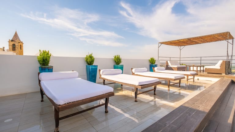 Willkommen im charmanten Boutique Hotel V, einer kleinen Luxusoase im Herzen der malerischen Altstadt von Vejer de la Frontera, einem der faszinierendsten weißen Dörfer an der Costa de la Luz. Tauchen Sie ein in die Geschichte dieses sorgfältig restaurierten Herrenhauses aus dem 16. Jahrhundert, das mit endlosen Details begeistert. Die Zimmer sind mit komfortablen Betten, hochwertiger Bettwäsche und exklusiven Annehmlichkeiten ausgestattet. Jedes verfügt über ein eigenes Bad mit Dusche oder Badewanne, einen Flachbildfernseher und eine Klimaanlage. Einige Zimmer bieten zudem Balkone. Für Ihre Bequemlichkeit bieten wir Ihnen einen kostenlosen Taxi-Service vom beliebigen Punkt in Vejer zu unseren Einrichtungen an. So können Sie Ihr Fahrzeug bequem auf einem Parkplatz oder an einem anderen Ort abstellen und direkt zum Hotel fahren. Im Boutique Hotel V erleben Sie die Magie Andalusiens und genießen gleichzeitig den atemberaubenden Ausblick auf die Landschaft von unserer exklusiven Panoramaterrasse, die einzigartig in ganz Vejer de la Frontera ist. Genießen Sie die Gesellschaft von Freunden oder Ihren Liebsten, während Sie lokale Weine probieren und unsere köstlichen Signature-Cocktails genießen. Das Boutique Hotel V ist der perfekte Ausgangspunkt, um das reiche monumentale Erbe von Vejer zu erkunden. Lassen Sie sich von der historischen Architektur und den kopfsteingepflasterten Straßen verzaubern und tauchen Sie in die Essenz dieses bezaubernden Ortes ein. Darüber hinaus ermöglicht unsere privilegierte Lage, nur 9 km vom Strand El Palmar entfernt, den Genuss goldener Sandstrände und kristallklaren Wassers. Der Benalup Golf & Country Club ist nur 22 km entfernt und der Club de Golf Campano 26 km. Der nächstgelegene Flughafen ist Jerez, der sich 79 km vom Hotel entfernt befindet. Kommen Sie und entdecken Sie die Schönheit von Vejer de la Frontera im unvergleichlichen Komfort und Stil unseres Hotels. Wir erwarten Sie mit offenen Armen!