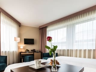 Die Zimmer sind mit Klimaanlage, Heizung, Doppelbett, Sofabett und einem Schreibtisch ausgestattet. Zur weiteren Einrichtung gehören ein Safe, ein Telefon, ein TV mit Satelliten-/Kabelempfang und WLAN. Die Badezimmer verfügen über eine Dusche oder Badewanne, Haartrockner und Kosmetikartikel. Einige Zimmer sind rollstuhlgerecht ausgestattet.