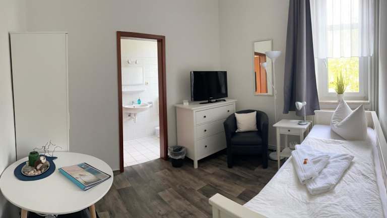 Die Pension Villa Frohsinn Sellin auf Rügen bietet helle Zimmer und Apartments im klassischen Stil. Die Zimmer sind mit einem Flachbild-TV ausgestattet und bieten eine schöne Aussicht auf den Garten. Die Apartments verfügen zudem über eine Küchenzeile, die ideal ist, um hausgemachte Mahlzeiten zuzubereiten. Die Badezimmer sind geräumig und bieten viel Komfort.