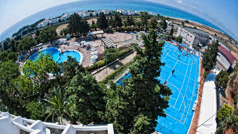 Das Hotel bietet einen Außenpool und einen Gartenbereich mit Liegestühlen, in dem Sie sich entspannen und die Sonne genießen können. Für aktive Gäste stehen Tennisplätze, ein Volleyballfeld und ein Fitnessstudio zur Verfügung. Der Strand ist nur wenige Meter entfernt und bietet Wassersportmöglichkeiten wie Windsurfen.