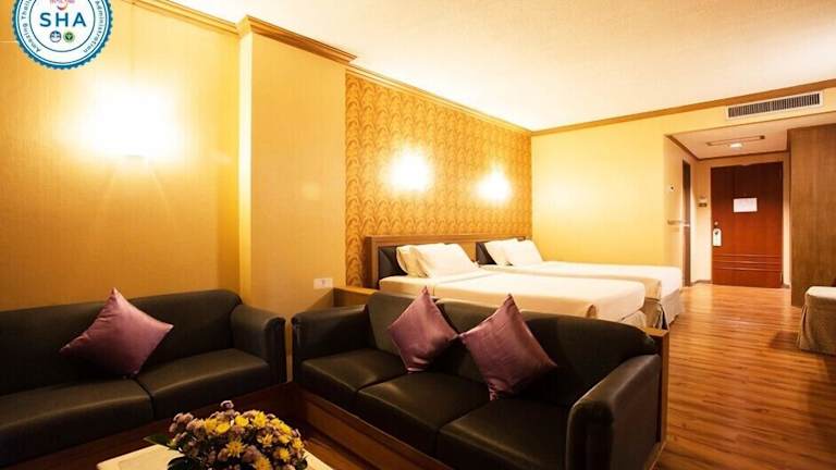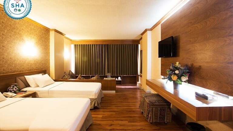 Das Wangtai Hotel in Surat Thani bietet Ihnen einen angenehmen Aufenthalt mit erstklassigem Service. Das Hotel verfügt über einen Außenpool, eine Sauna und Fitnessmöglichkeiten. Kostenloses WLAN und Unterstützung bei der Tourenplanung sind ebenfalls verfügbar. Genießen Sie Ihre Mahlzeiten im hoteleigenen Restaurant oder lassen Sie sich den Zimmerservice auf Ihr Zimmer bringen. Das Hotel bietet zudem kostenfreie Parkplätze und einen Flughafentransfer gegen Gebühr. Die Zimmer sind komfortabel und mit einer Minibar ausgestattet. Die Lage des Hotels ist günstig, in der Nähe des Ban Don Floating Market und des Pho Tempels.