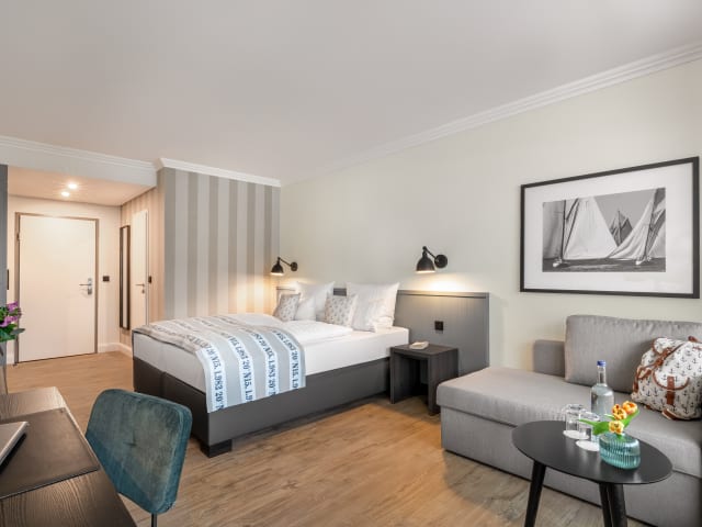 Insgesamt 60 komfortabel und modern eingerichtete Doppelzimmer und Suiten stehen zur Verfügung. Alle Zimmer sind mit Bad/WC, Balkon, Telefon, Safe, Minibar, Radio und Kabel-TV und W-LAN ausgestattet und sorgen so für Ihr Wohlbefinden.