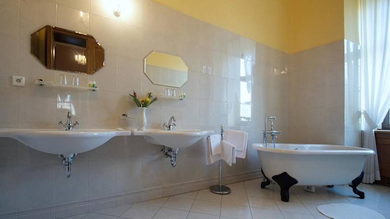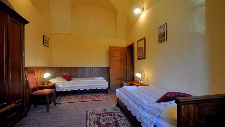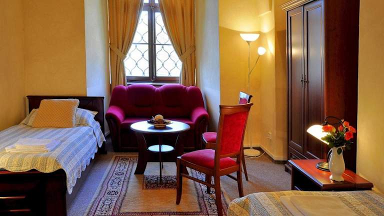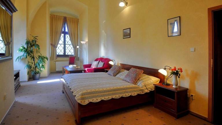 Die Zimmer im Zamek Cerveny Hradek sind im barocken Stil eingerichtet und verfügen über dunkles Holzmobiliar und barocke Einrichtungselemente. Die meisten Zimmer haben ein eigenes Bad, während einige Zimmer ein Gemeinschaftsbad nutzen. Einige Zimmer sind mit Kronleuchtern und Parkettböden ausgestattet. Zur Ausstattung gehören auch Kabel- oder Sat-TV und kostenfreies WLAN. Privatparkplätze stehen den Gästen ebenfalls zur Verfügung.