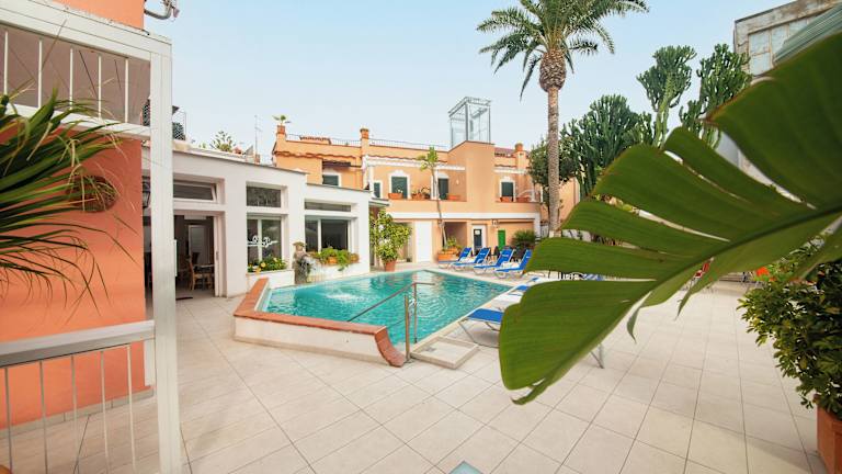 Das Hotel Terme Zi 'Carmela befindet sich in der Hauptstadt von Ischia und ist nur wenige Schritte vom historischen Zentrum entfernt. Hier können Sie die charmante Atmosphäre der Stadt genießen und die Sehenswürdigkeiten und Geschäfte erkunden. Die Lage des Hotels bietet auch einen einfachen Zugang zu den Stränden und anderen Attraktionen der Insel.
