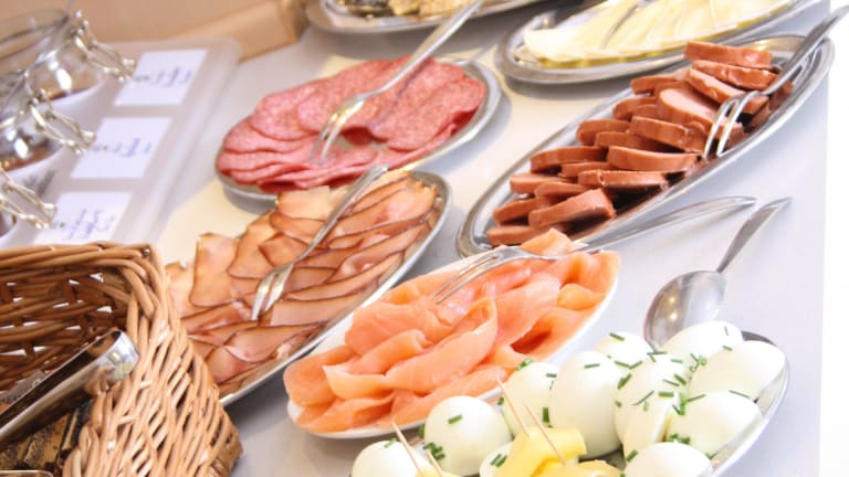 Umfangreiches Langschläferfrühstück in Buffetform. Neue, schöne Frühstücksterasse für sonnige Tage.