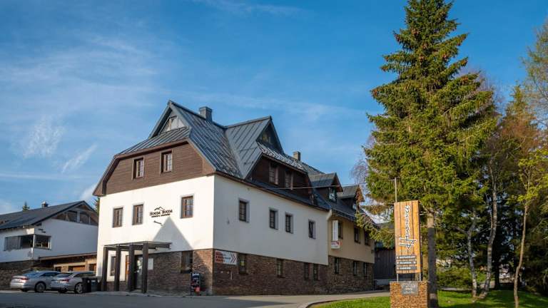 Das Hotel Houda Bouda liegt in Boží Dar und bietet eine ideale Lage für Skifahrer und Naturliebhaber. Die nächste Skipiste ist nur 100 m entfernt und der Berg Klínovec ist nur eine 4-minütige Fahrt entfernt. Die Umgebung bietet auch verschiedene Wander- und Radwege direkt vor der Tür. In der Nähe des Hotels finden Sie auch Restaurants und Bars, die nur 50 m entfernt sind. Der Skilift Novako ist ebenfalls in der Nähe. Der internationale Flughafen Karlsbad ist mit dem Auto in nur 25 Minuten erreichbar.