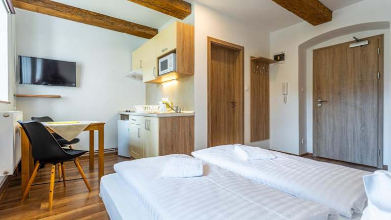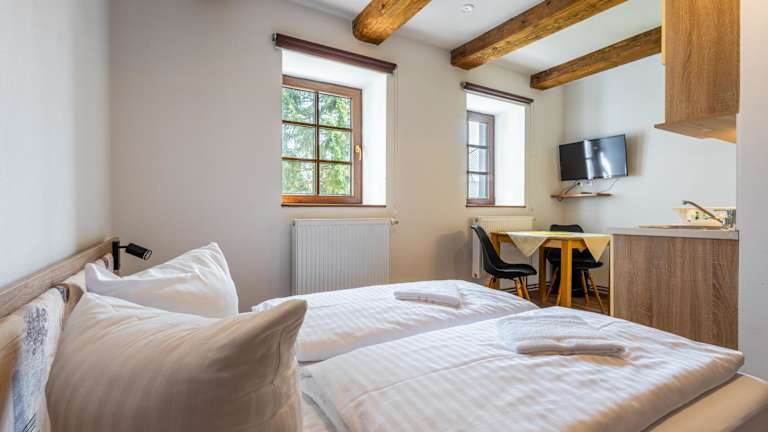 Das Hotel Houda Bouda in Boží Dar ist der ideale Ausgangspunkt für Skifahrer und Naturliebhaber. Mit nur 100 m Entfernung zur Skipiste und einer kurzen Fahrt zum Berg Klínovec bietet das Hotel eine praktische Lage. Die Unterkünfte sind gemütlich und mit Sat-TV ausgestattet. Das Studio-Apartment verfügt über eine gut ausgestattete Küche und einen separaten Sitzbereich. Das täglich servierte Frühstück sorgt für einen guten Start in den Tag. Restaurants und Bars befinden sich in unmittelbarer Nähe. Wander- und Radwege befinden sich direkt vor der Tür. Der Skilift Novako ist ebenfalls in der Nähe. Der internationale Flughafen Karlsbad ist mit dem Auto in nur 25 Minuten erreichbar.
