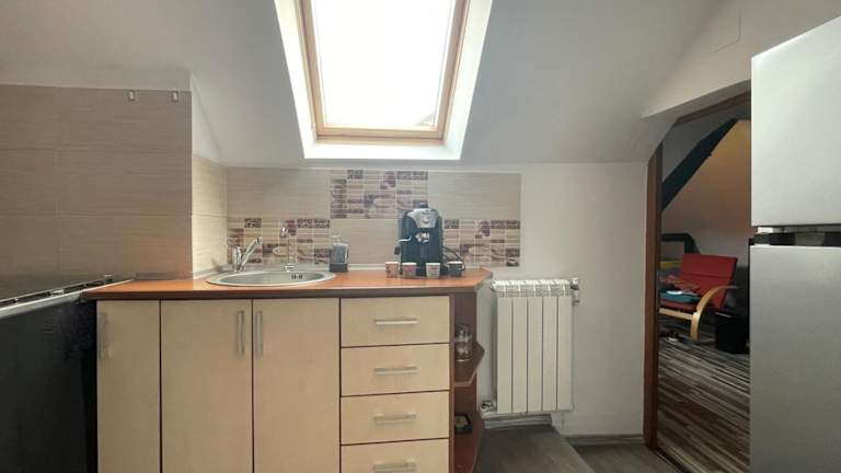 Die Unterkunft verfügt über eine voll ausgestattete Küche mit einem Kühlschrank und einer Kaffeemaschine.