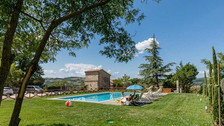 Das I Casali di Villa Benveduti in Gubbio, Umbrien, ist eine charmante Unterkunft, die kostenfreie Privatparkplätze bietet. Hier können Sie in komfortablen Zimmern mit Flachbild-TV und eigenem Bad mit kostenlosen Pflegeprodukten übernachten. Die Unterkunft verfügt über eine gut ausgestattete Küche und einige Zimmer bieten einen Balkon oder eine Terrasse mit Blick auf den Pool. Entspannen Sie im Außenpool, erkunden Sie den schönen Garten oder machen Sie eine Wanderung in der Umgebung. Die Lage ist ideal, um die Kathedrale von Perugia und die Kirche San Severo - Perugia zu besuchen. Der nächstgelegene Flughafen ist der Flughafen Perugia, der etwa 49 km entfernt liegt. Ein kostenpflichtiger Flughafentransfer wird angeboten.