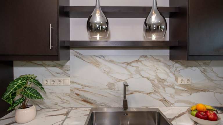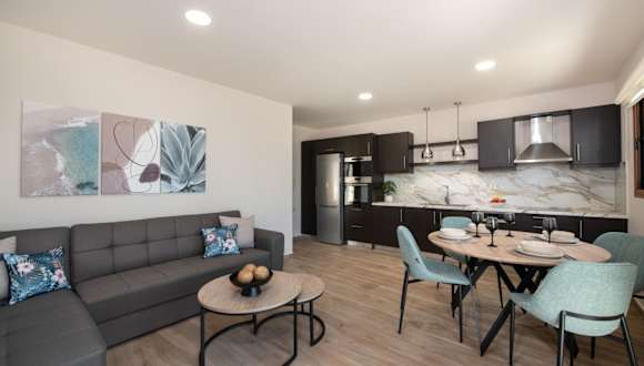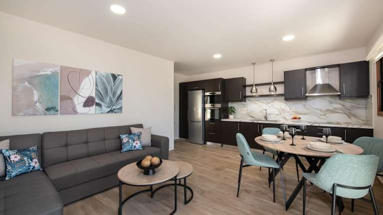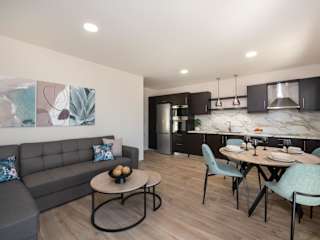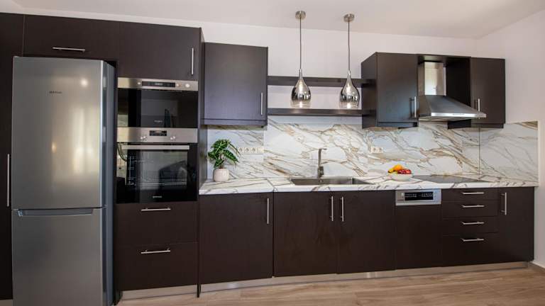 Die Unterkunft umfasst eine Küche, die mit einem Kühlschrank und einem Geschirrspüler ausgestattet ist, um die Selbstverpflegung zu ermöglichen.