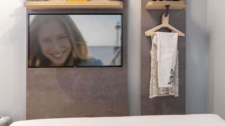 Das Zimmer ist klein und unpraktisch eingerichtet.