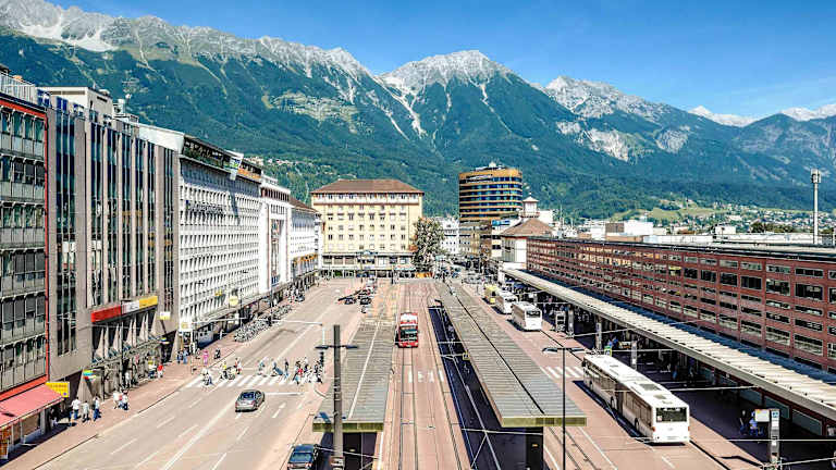 Zentrale Lage, direkt am Hauptbahnhof Innsbruck, nur 500m von der Triumph Pforte und 5 Gehminuten vom Stadtzentrum entfernt.