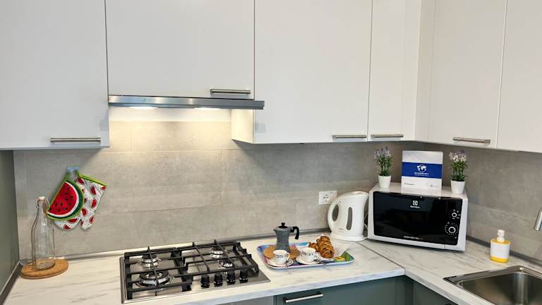 Die Ferienwohnung verfügt über ein Schlafzimmer, ein Wohnzimmer und eine voll ausgestattete Küchenzeile mit Kühlschrank und Wasserkocher. Das Badezimmer ist mit einem Bidet und einer Dusche ausgestattet. Handtücher und Bettwäsche können gegen Aufpreis bereitgestellt werden.