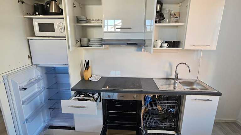 Die Wohnung umfasst 1 Schlafzimmer, eine komplett ausgestattete Küche mit Kühlschrank und Geschirrspüler sowie 1 Badezimmer mit Bidet und Dusche. Handtücher und Bettwäsche werden in der Unterkunft bereitgestellt.