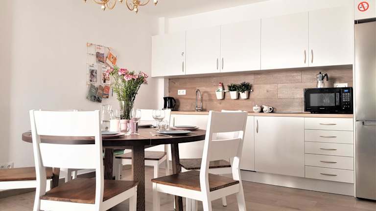 Das klimatisierte Apartment verfügt über 4 Schlafzimmer, ein geräumiges Wohnzimmer und eine voll ausgestattete Küche. Die Zimmer sind komfortabel eingerichtet und bieten den Gästen einen angenehmen Aufenthalt. Handtücher und Bettwäsche werden gestellt, so dass Sie sich um nichts kümmern müssen. Auf der Terrasse können Sie entspannte Stunden verbringen und die frische Luft genießen.