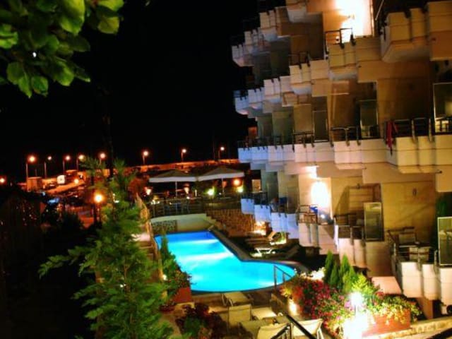 Das Hotel befindet sich in Nea Skioni, direkt am Sandstrand, was eine attraktive Lage für Strandliebhaber bietet.