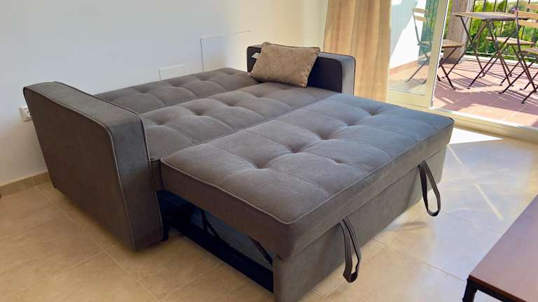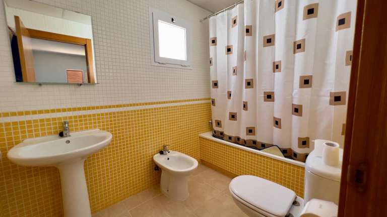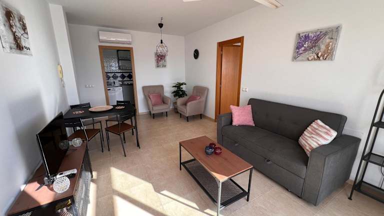 Die Wohnung ist klimatisiert und besteht aus 2 Schlafzimmern, einem Wohnzimmer sowie einer voll ausgestatteten Küche, die mit einem Kühlschrank und einer Kaffeemaschine ausgestattet ist. Es gibt zudem 2 Badezimmer mit Bidet und Dusche. Ein Flachbild-TV mit Kabelkanälen ist ebenfalls vorhanden.