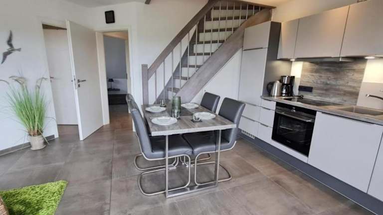 Die Ferienwohnung verfügt über eine vollständig ausgestattete Küche mit Kühlschrank, Geschirrspüler, Mikrowelle und Kaffeemaschine, was die Selbstversorgung ermöglicht. Restaurant- und Verpflegungsoptionen wurden nicht angegeben.